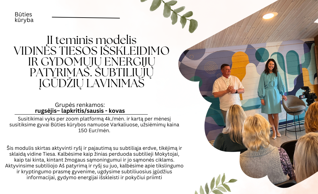 Šis modulis skirtas aktyvinti ryšį ir pajautimą su subtiliąja erdve, tikėjimą ir sklaidą vidine Tiesa. Kalbėsime kaip žinias perduoda subtilieji Mokytojai, kaip tai kinta, kintant žmogaus sąmoningumui ir jo sąmonės ciklams. Aktyvinsime subtiliojo Aš patyrimą ir ryšį su juo, kalbėsime apie tikslingumo ir kryptingumo prasmę gyvenime, ugdysime subtiliuosius įgūdžius informacijai, gydymo energijai išskleisti ir pokyčiui priimti.
